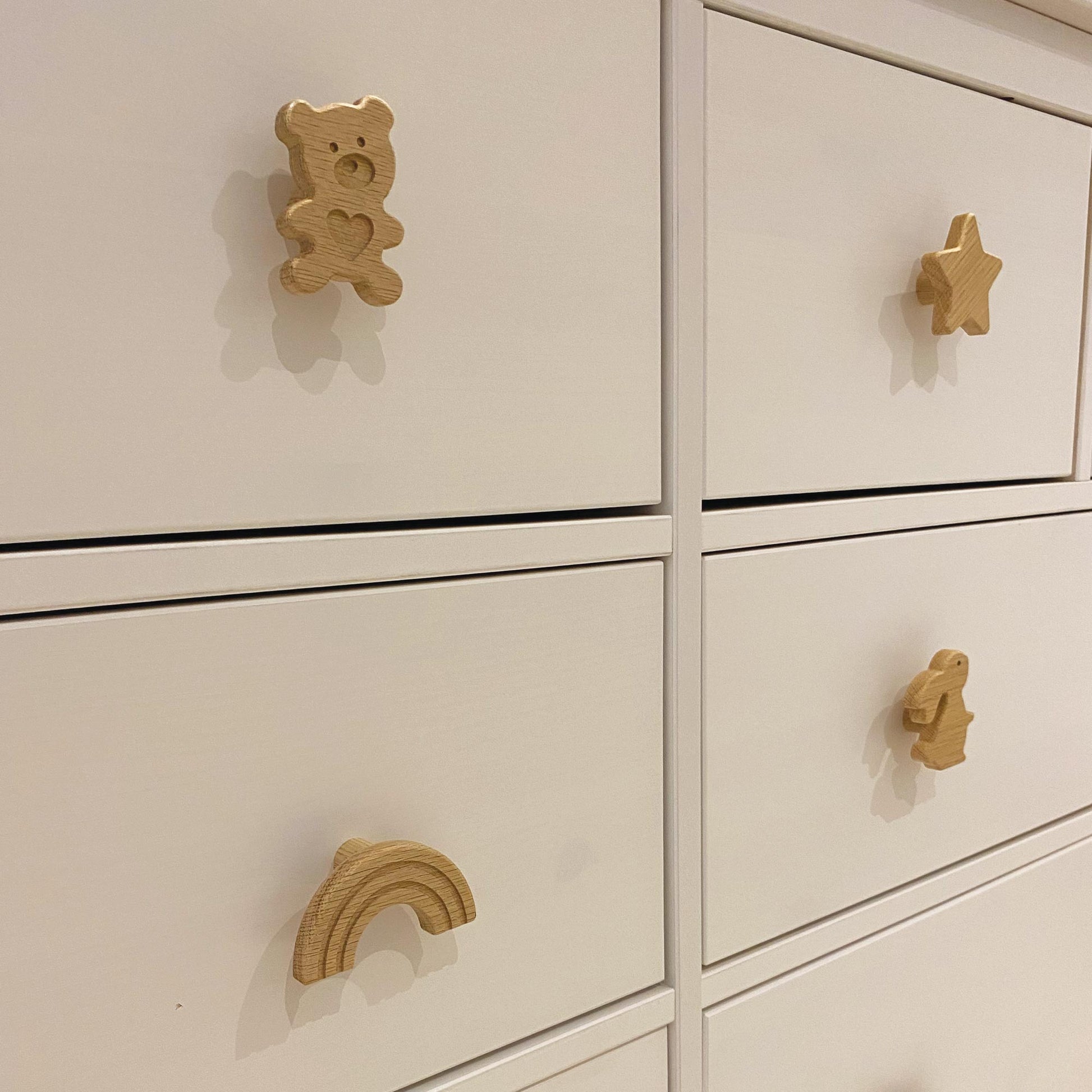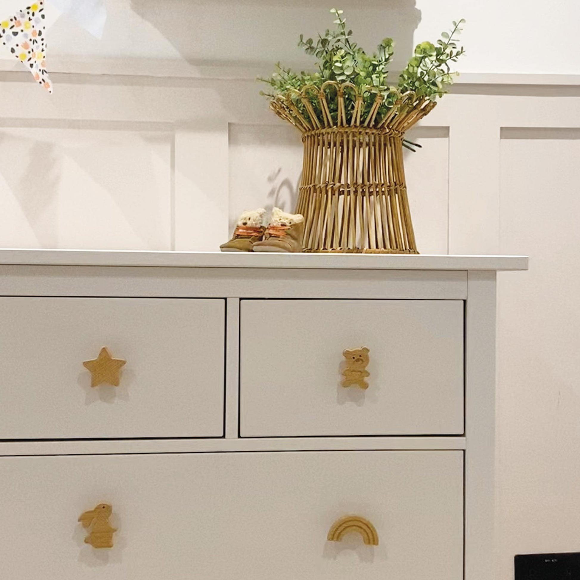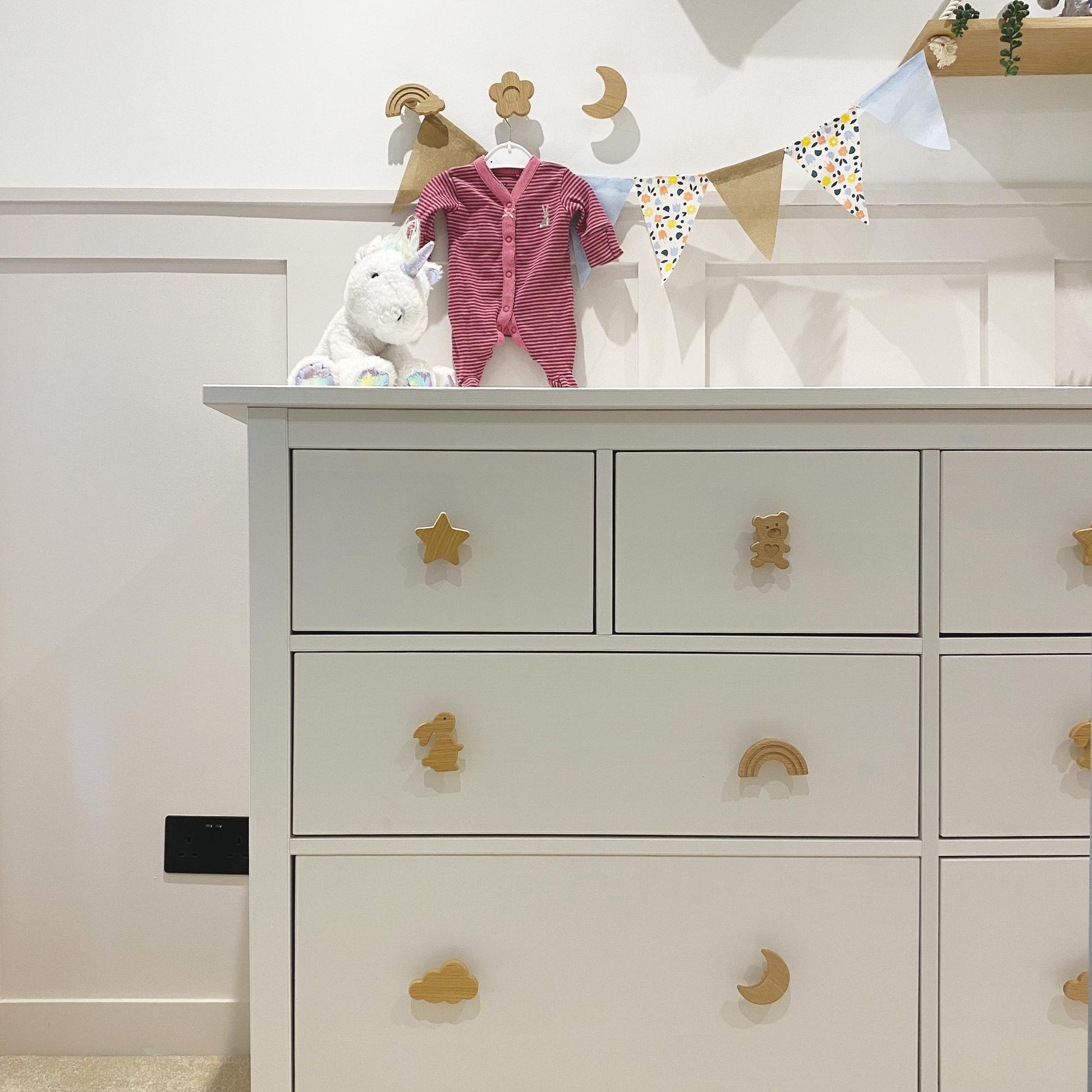If you want unique nursery décor for your new arrival, then these baby drawer handles are perfect for you. Use them to upcycle an existing piece of furniture, or add them to a new piece to bring some extra character to your baby’s nursery design. The set includes a star, moon, cloud, rainbow, teddy bear and rabbit.