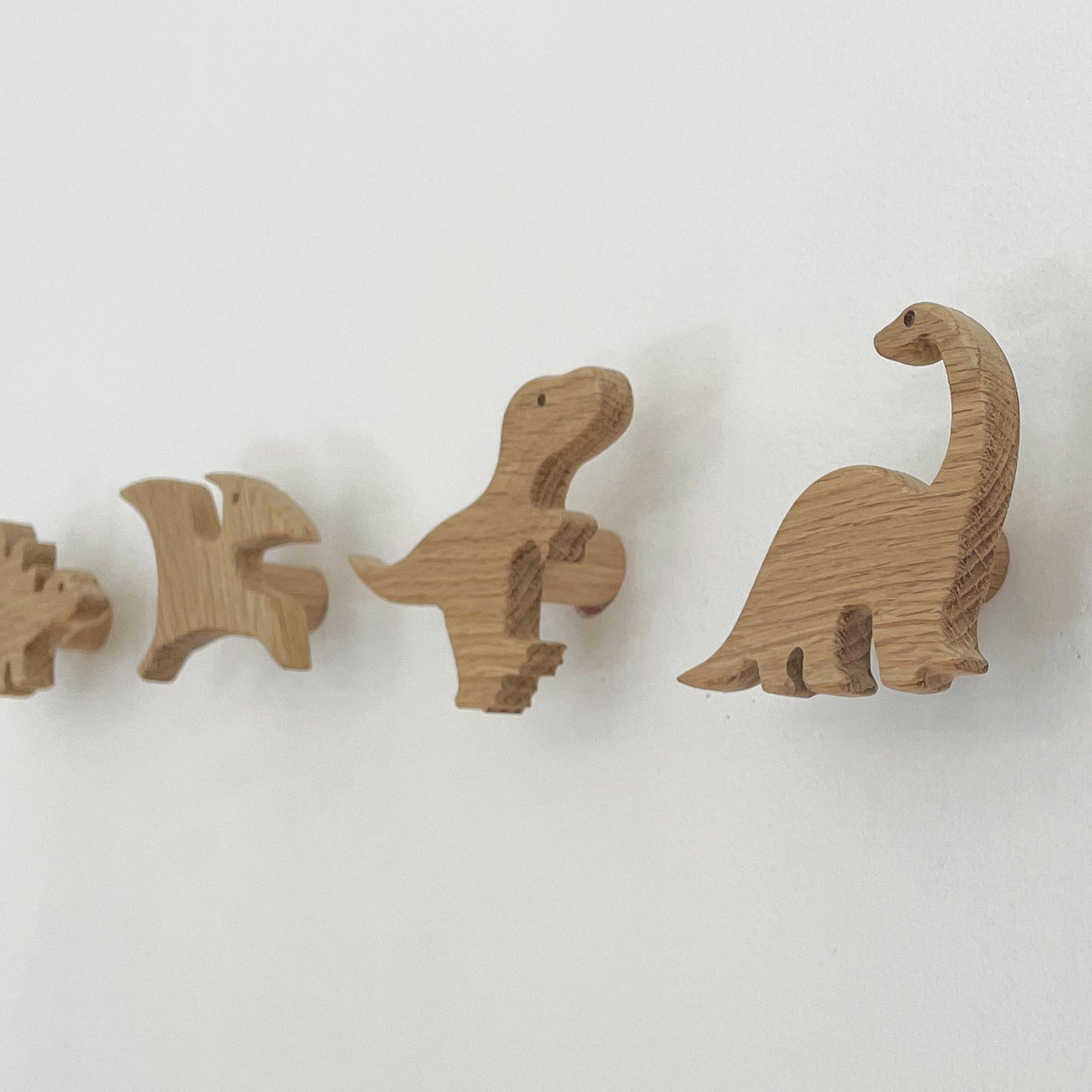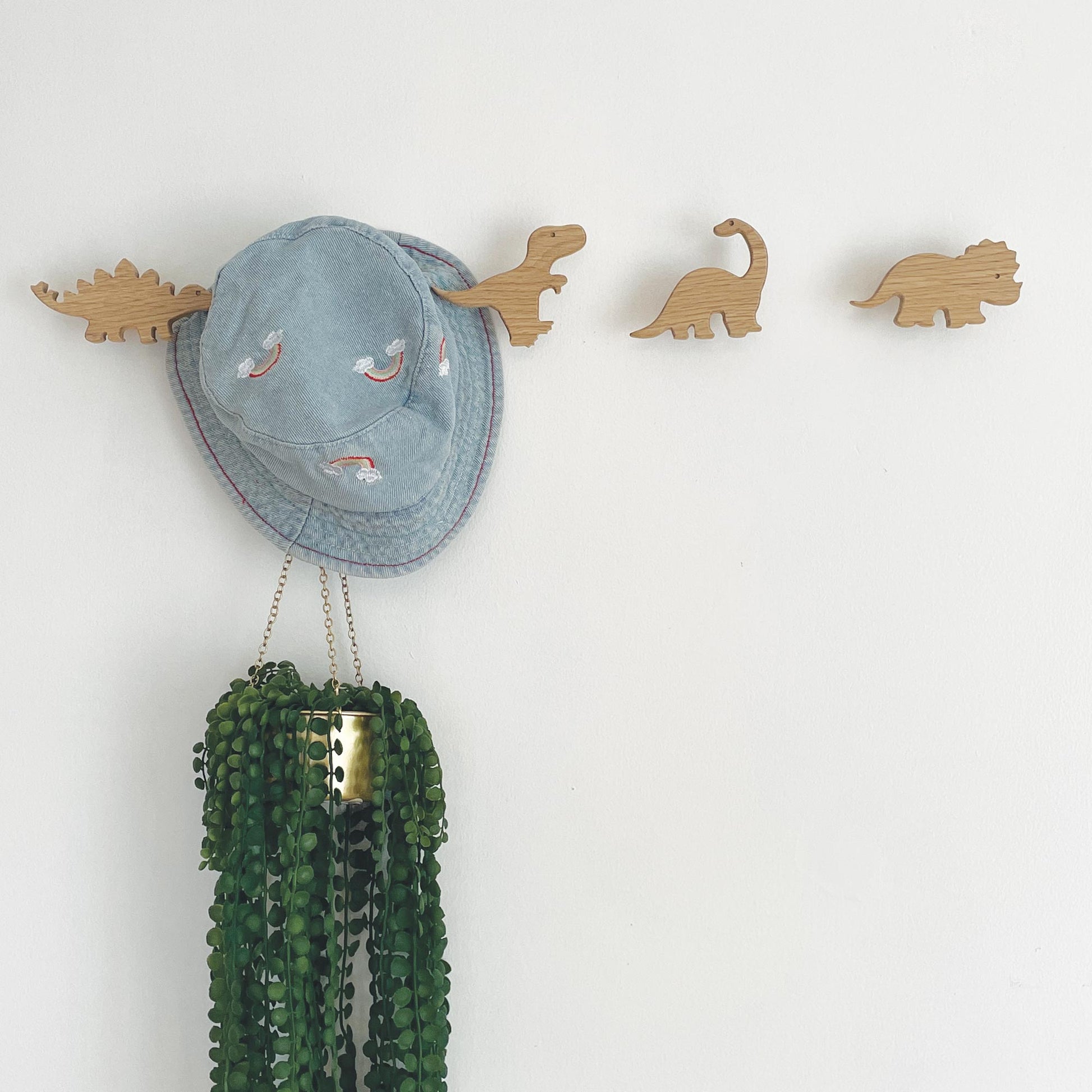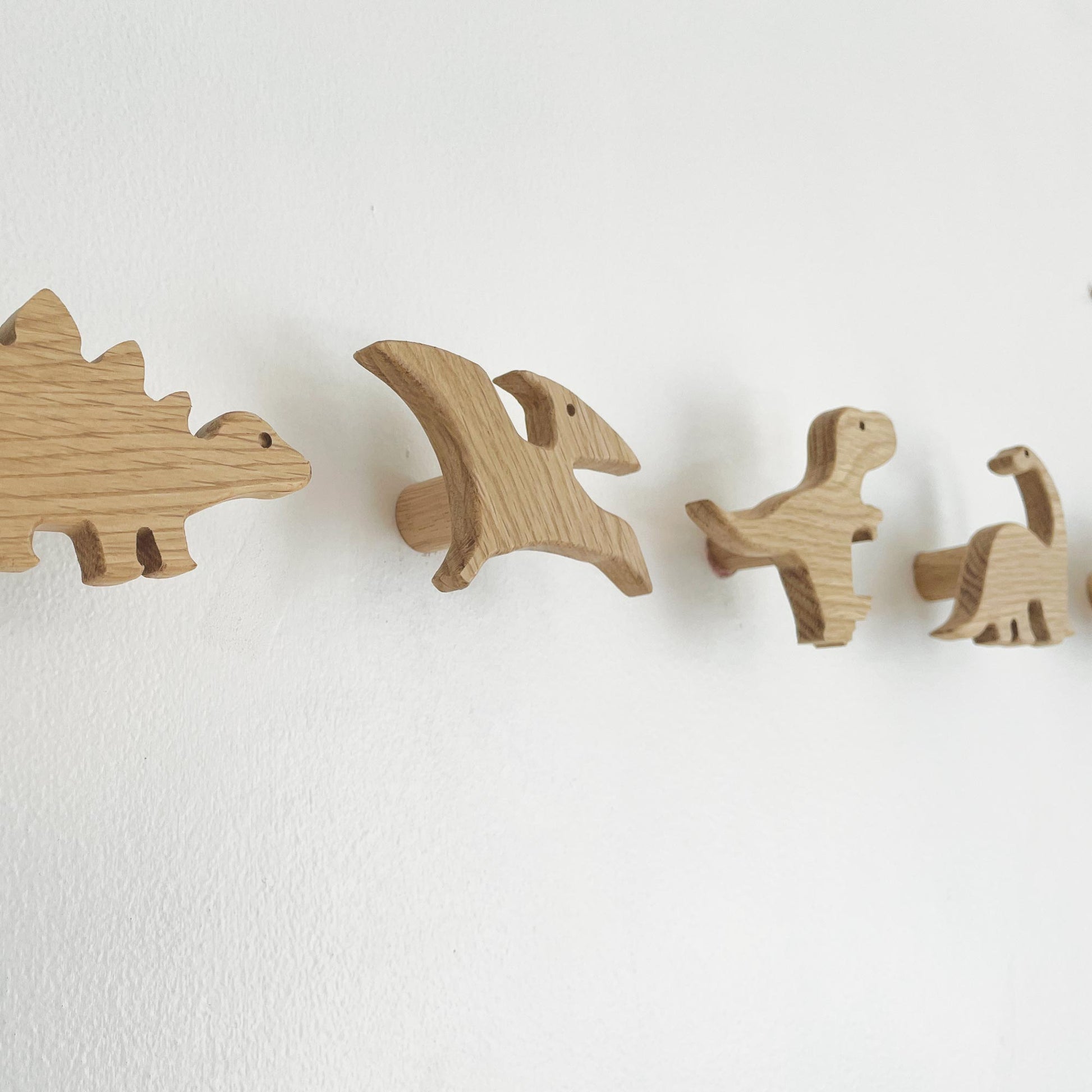 These completely unique dinosaur animal wall hooks look amazing in a nursery as well as a quirky entryway. They are sure to get the attention of anyone that comes into your home! This whimsical set of five wall hooks includes a Brontosaurus, a T-Rex, a Stegosaurus, a Pterodactyl and a Triceratops. These neutral nursery décor pieces have a simple yet luxury look, and each feature small engraved eyes to bring them to life.