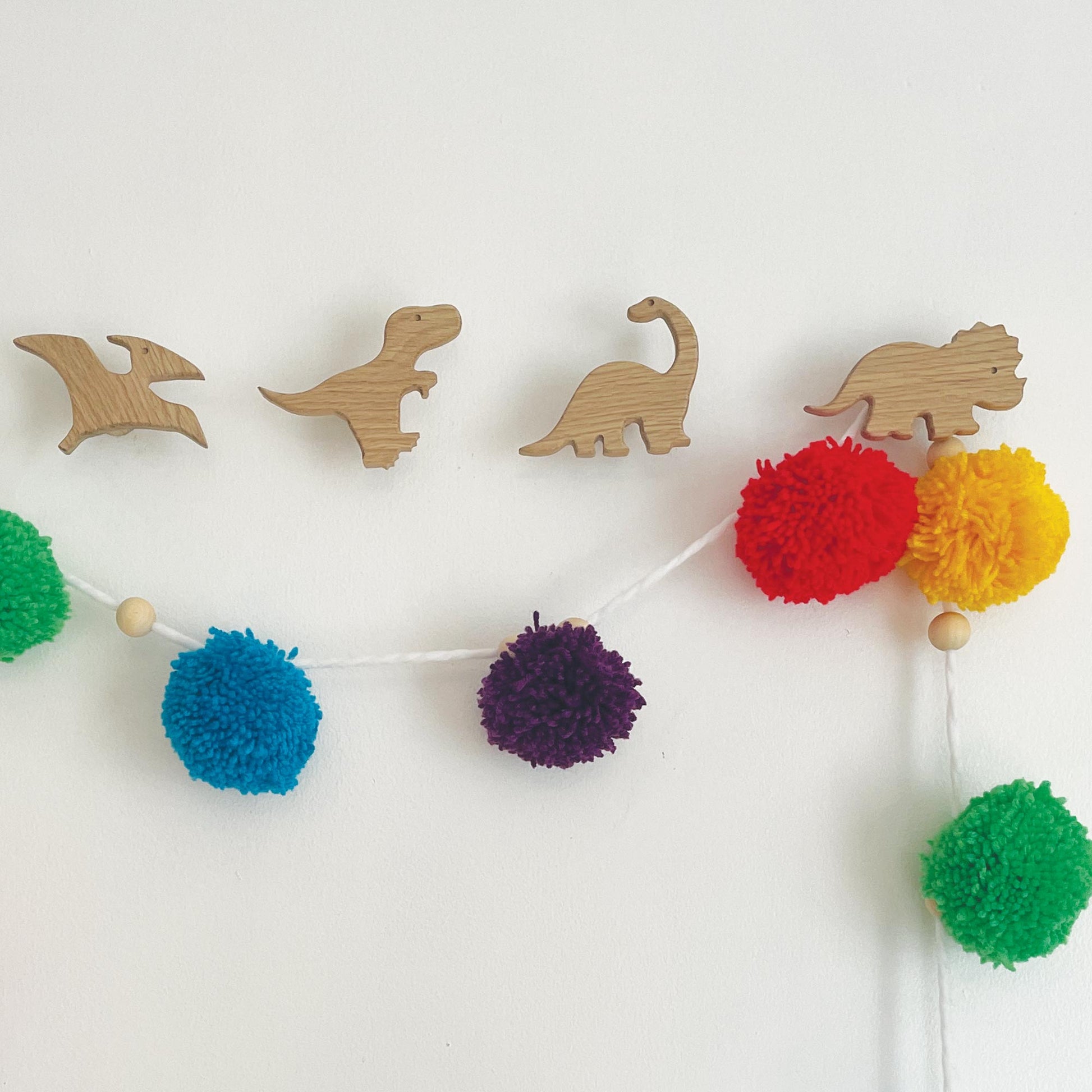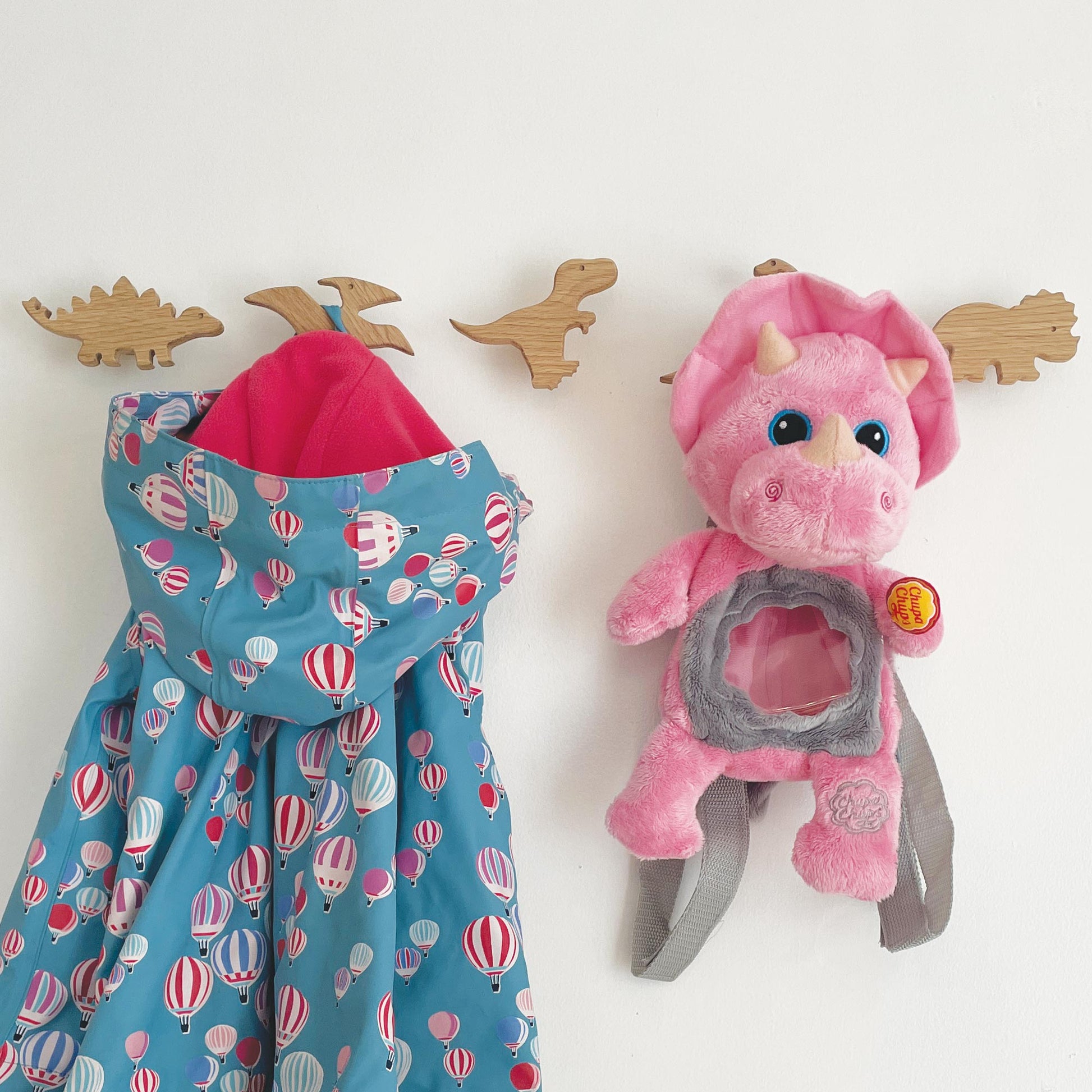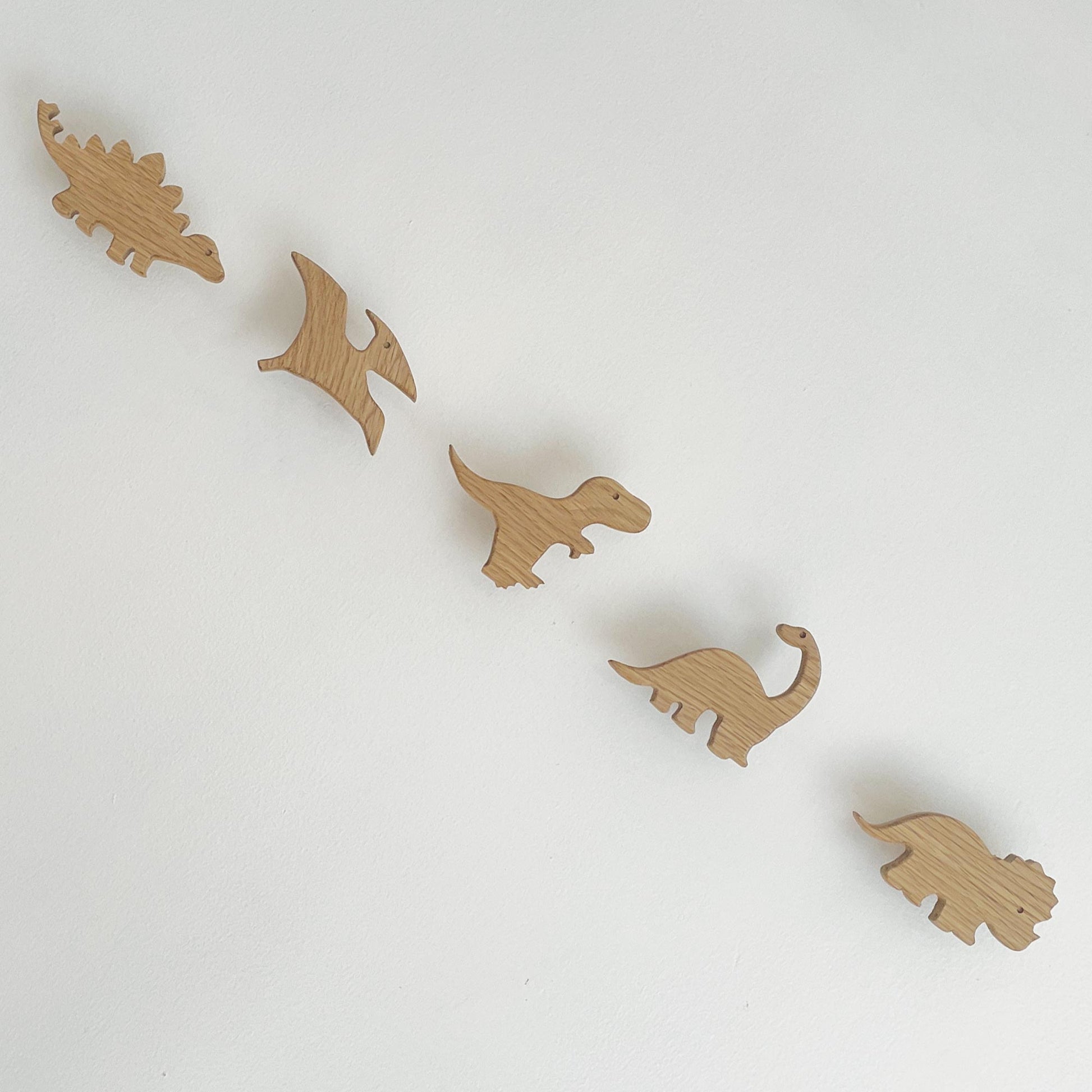 These completely unique dinosaur animal wall hooks look amazing in a nursery as well as a quirky entryway. They are sure to get the attention of anyone that comes into your home! This whimsical set of five wall hooks includes a Brontosaurus, a T-Rex, a Stegosaurus, a Pterodactyl and a Triceratops. These neutral nursery décor pieces have a simple yet luxury look, and each feature small engraved eyes to bring them to life.