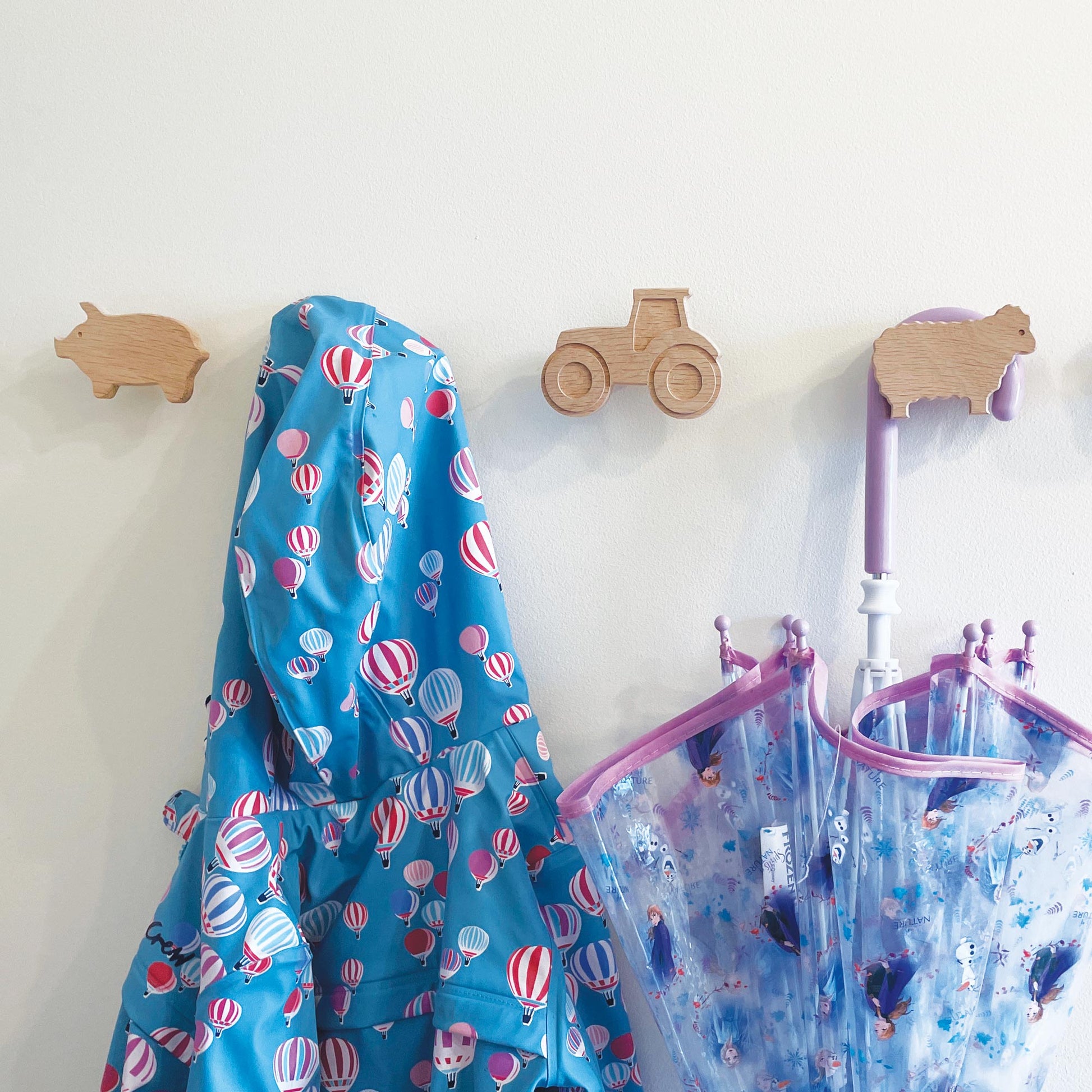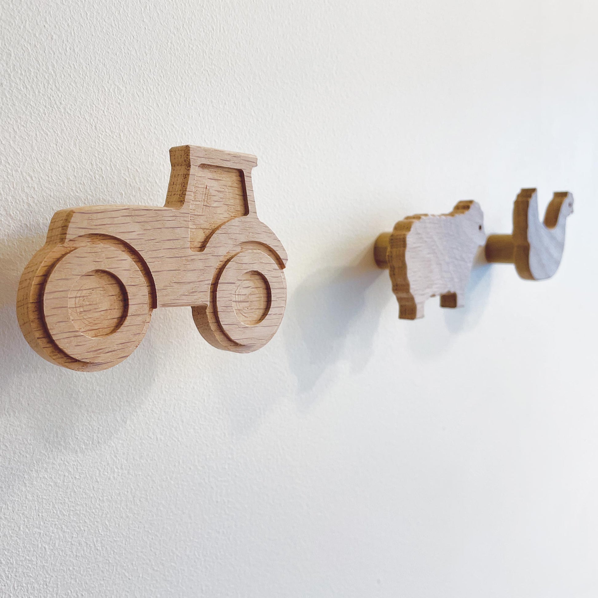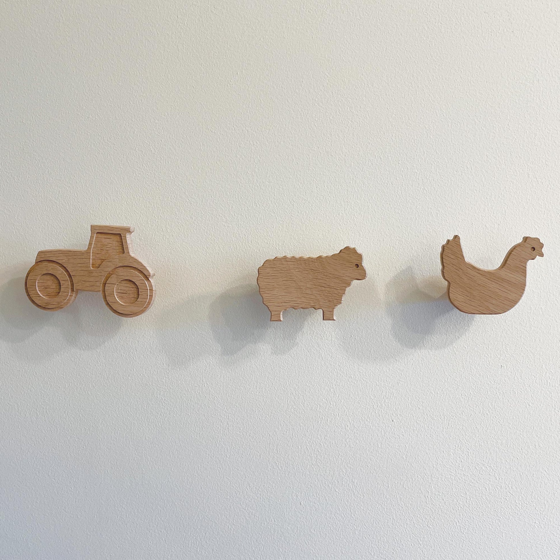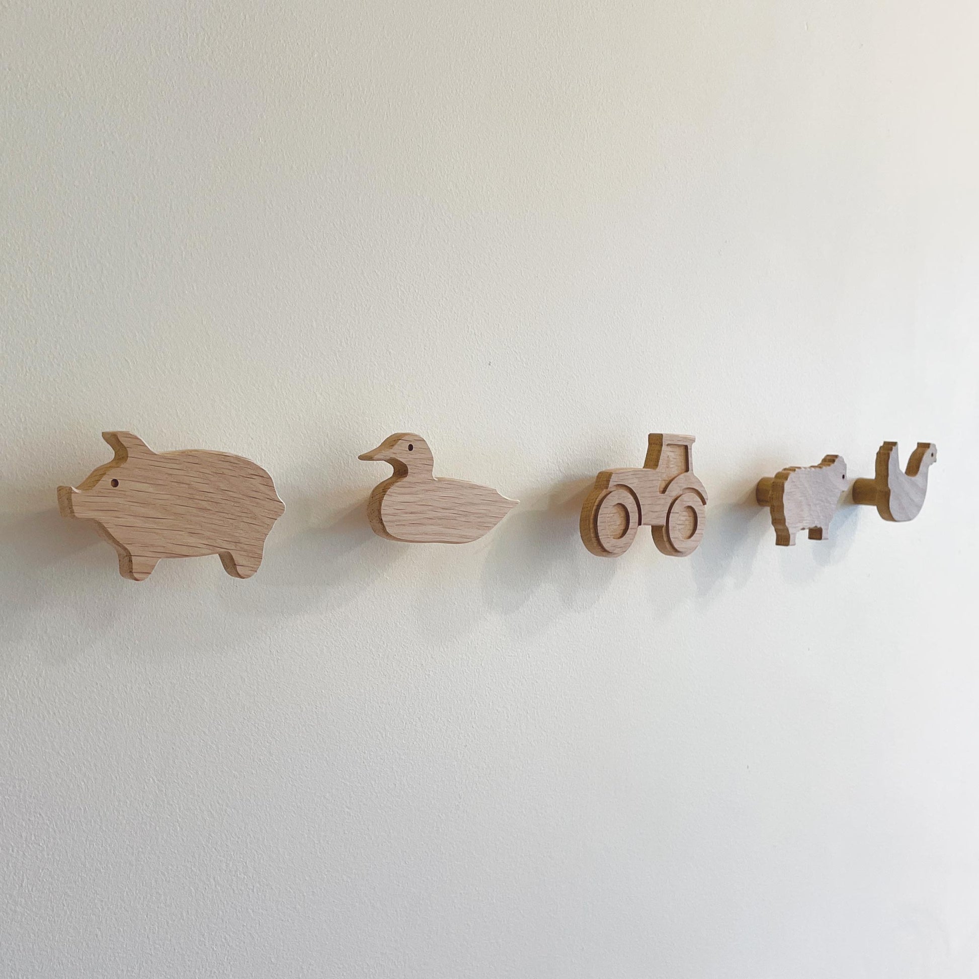 This set of farmyard animal themed wall hooks includes a pig, sheep, chicken, duck and a tractor, all made in the UK from solid oak. They are bound to get the attention of little ones in a playroom or nursery, and also look great in a farmhouse entryway or boot room!