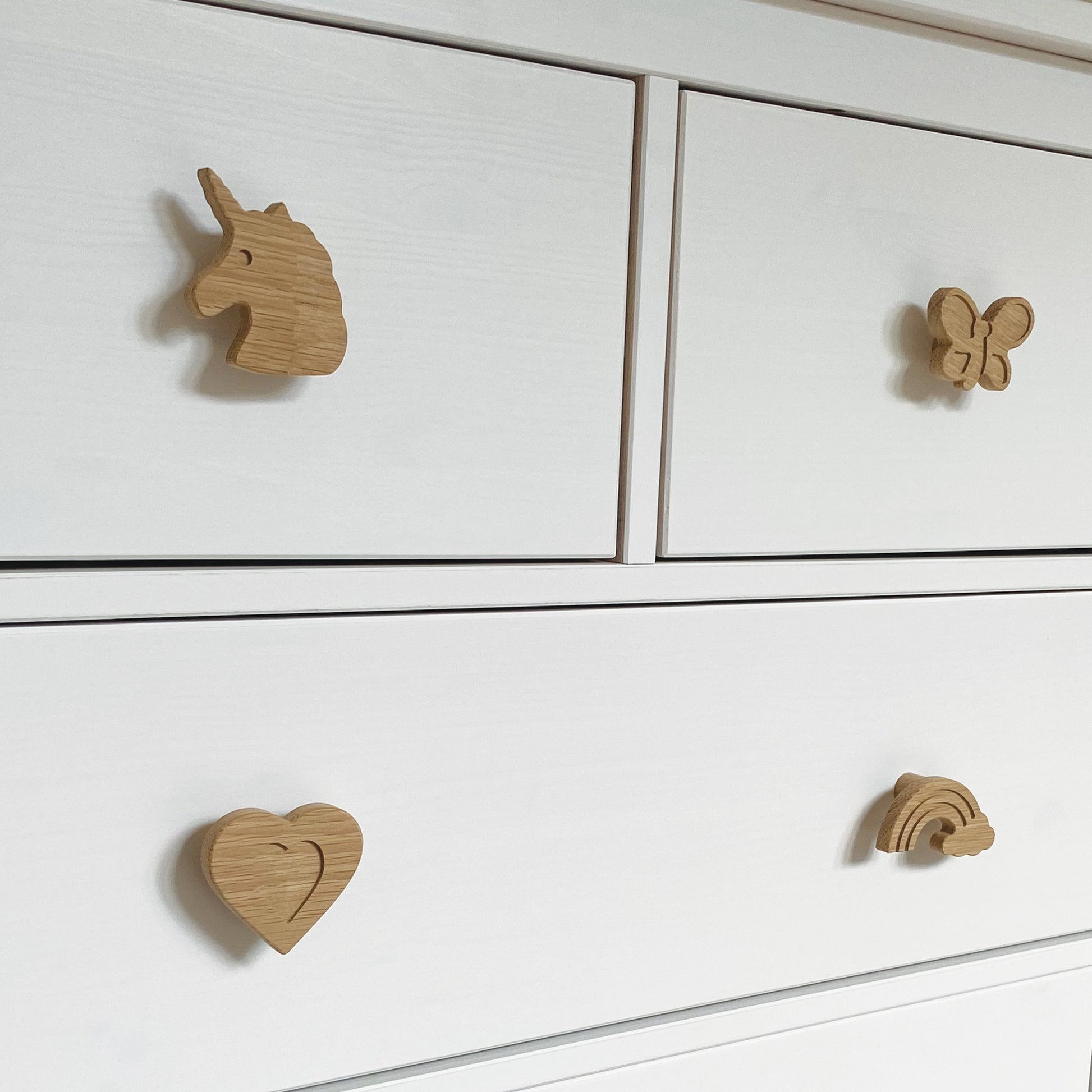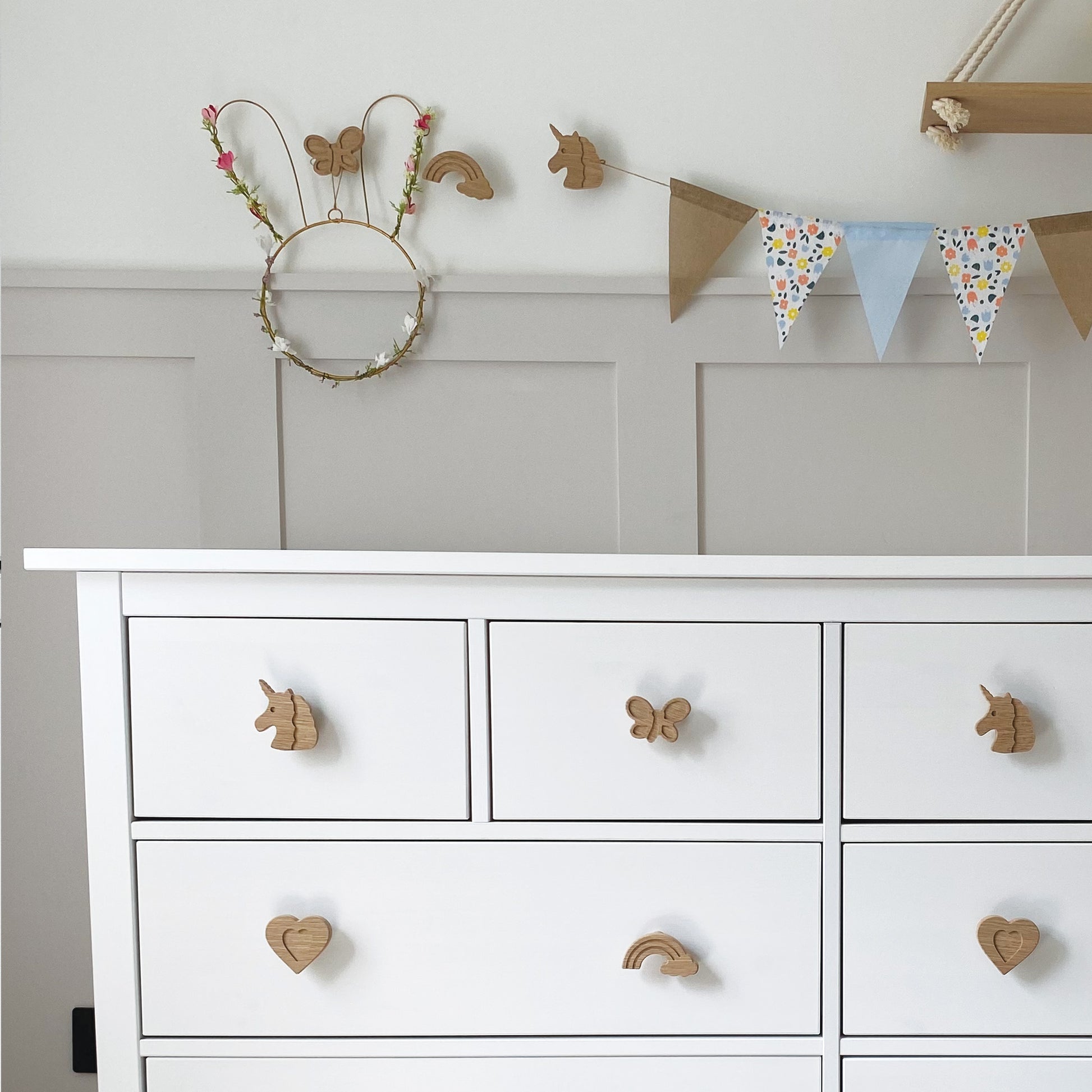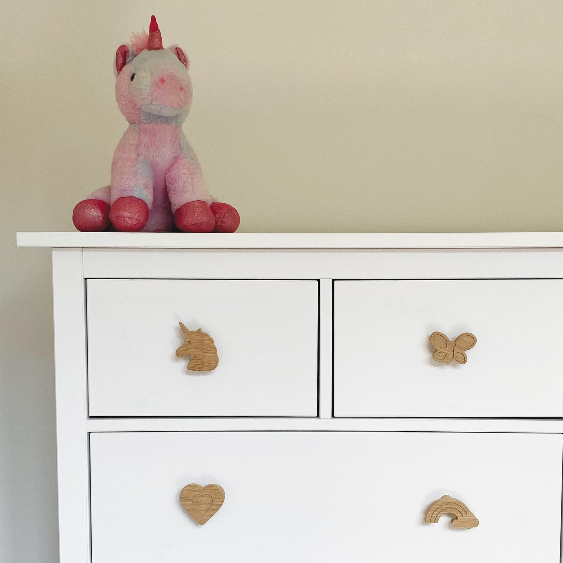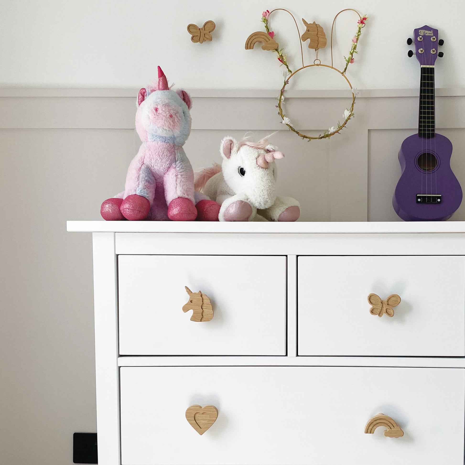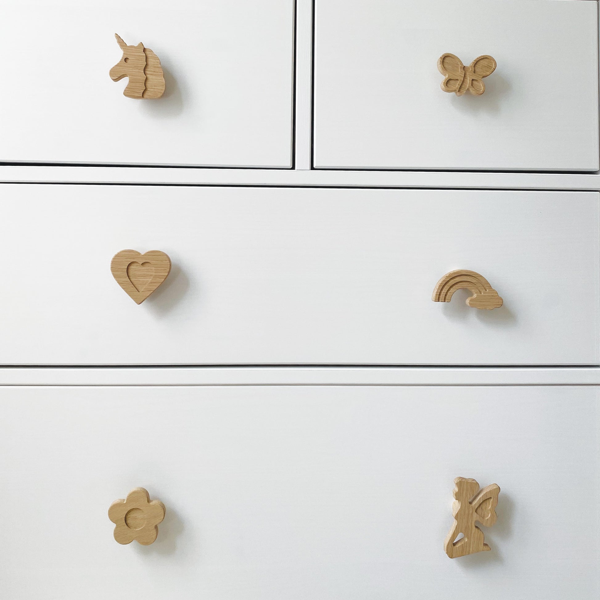 Create a unique girls nursery with these adorable solid oak drawer handles / drawer pulls. This set of six designs includes a unicorn, butterfly, fairy, heart, flower and rainbow. These drawer handles have been designed to add a unique piece of girls nursery decor to your little ones bedroom or playroom. They can be used as drawer handles or wardrobe handles and are perfect for upgrading a new piece of furniture, or upcycling something you already own to give it a new lease of life. If you or your little one loves unicorns, flowers and butterflies, then this is the set for you!