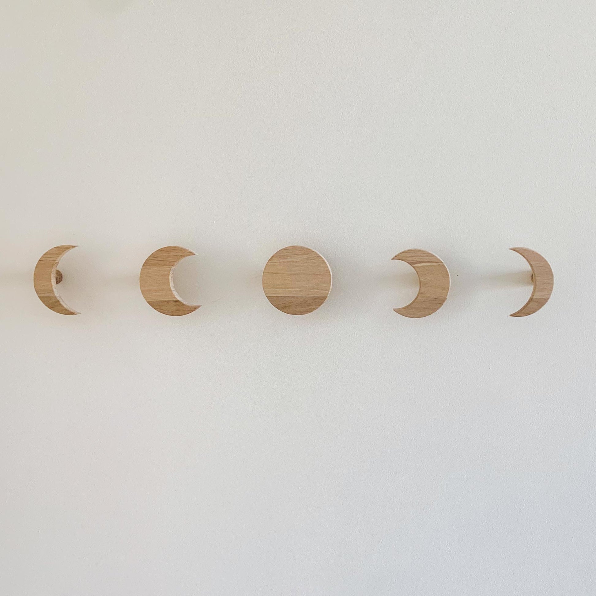 These unique pieces of moon phase décor are both beautiful and practical! Wooden wall hooks are easy to install, will last, and are perfect for a bedroom, dressing room or entryway for hanging your clothes, purses, coats or jewellery. This set of five solid oak wall hanging hooks are shaped in 5 phases of the moon, featuring a beautiful full moon in the centre. If you are on the hunt for moon phases wall décor then these hooks are not only beautiful, but are practical too!