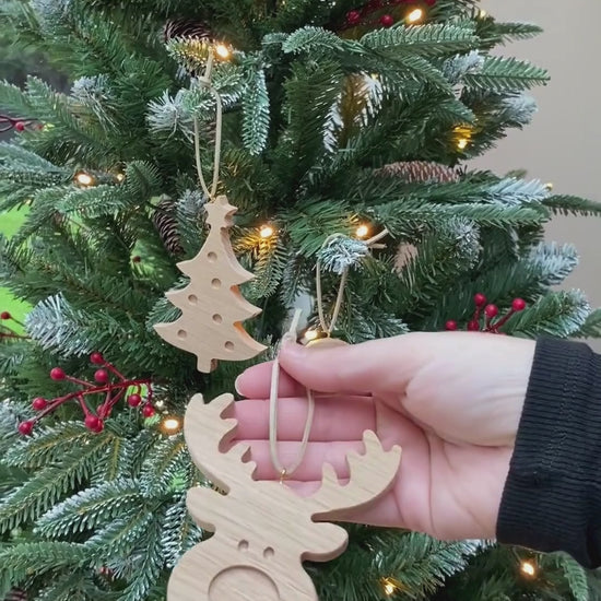 Create a traditional look this Christmas with this set of 3 solid oak Christmas tree ornaments. This set contains a reindeer, snowman and Christmas tree, finished with a golden hook and faux suede hanging thread. Why not create your own family of snowmen to bring out for years to come!