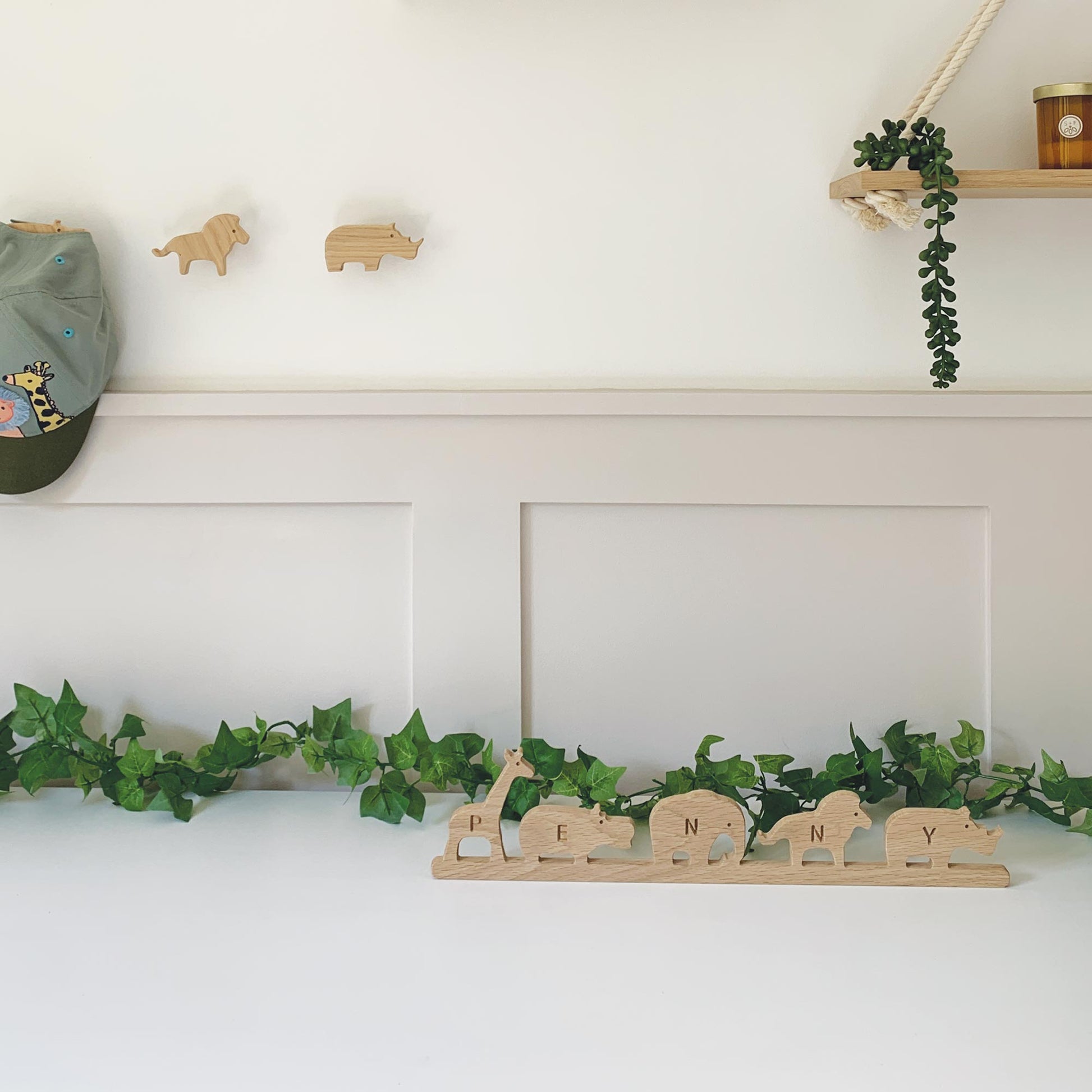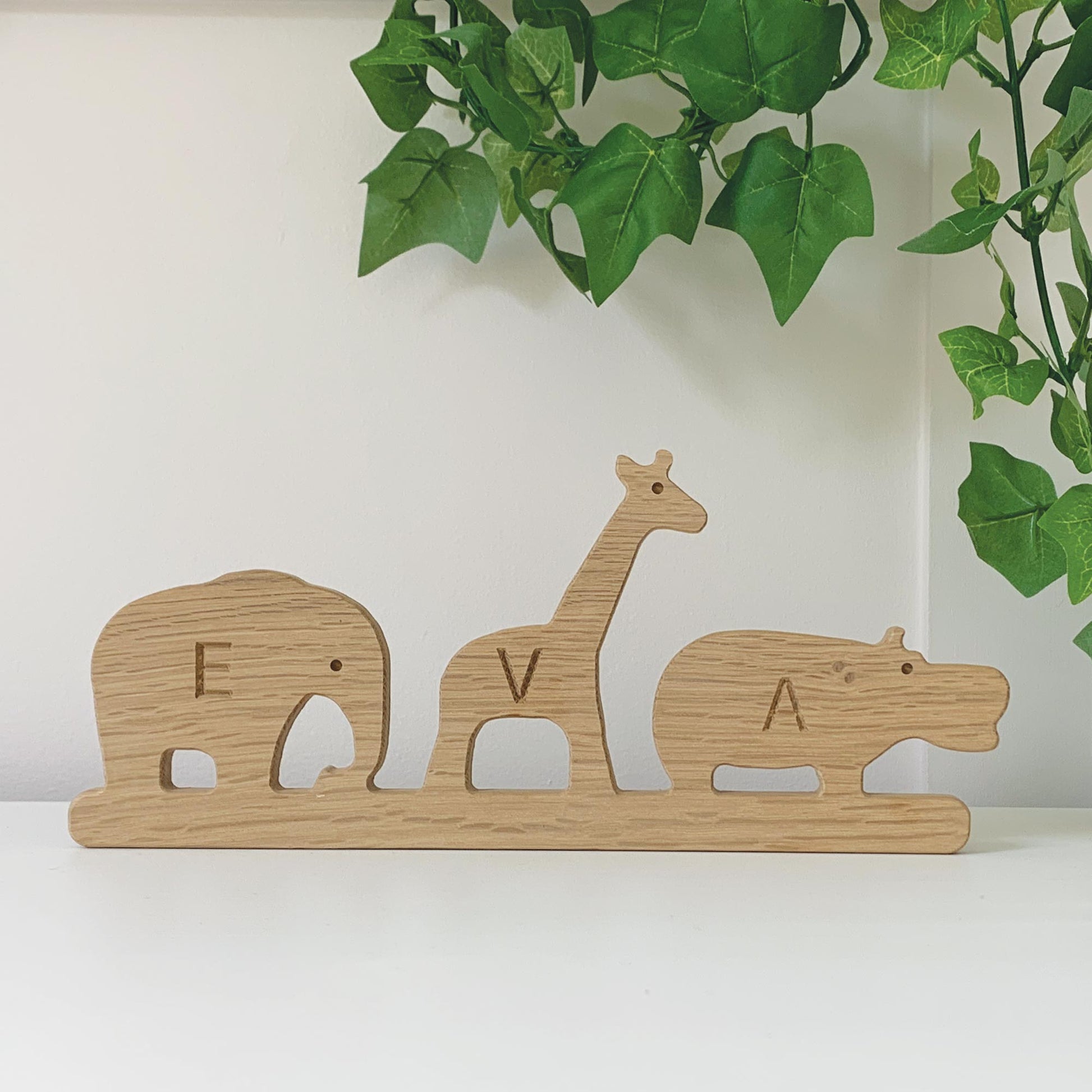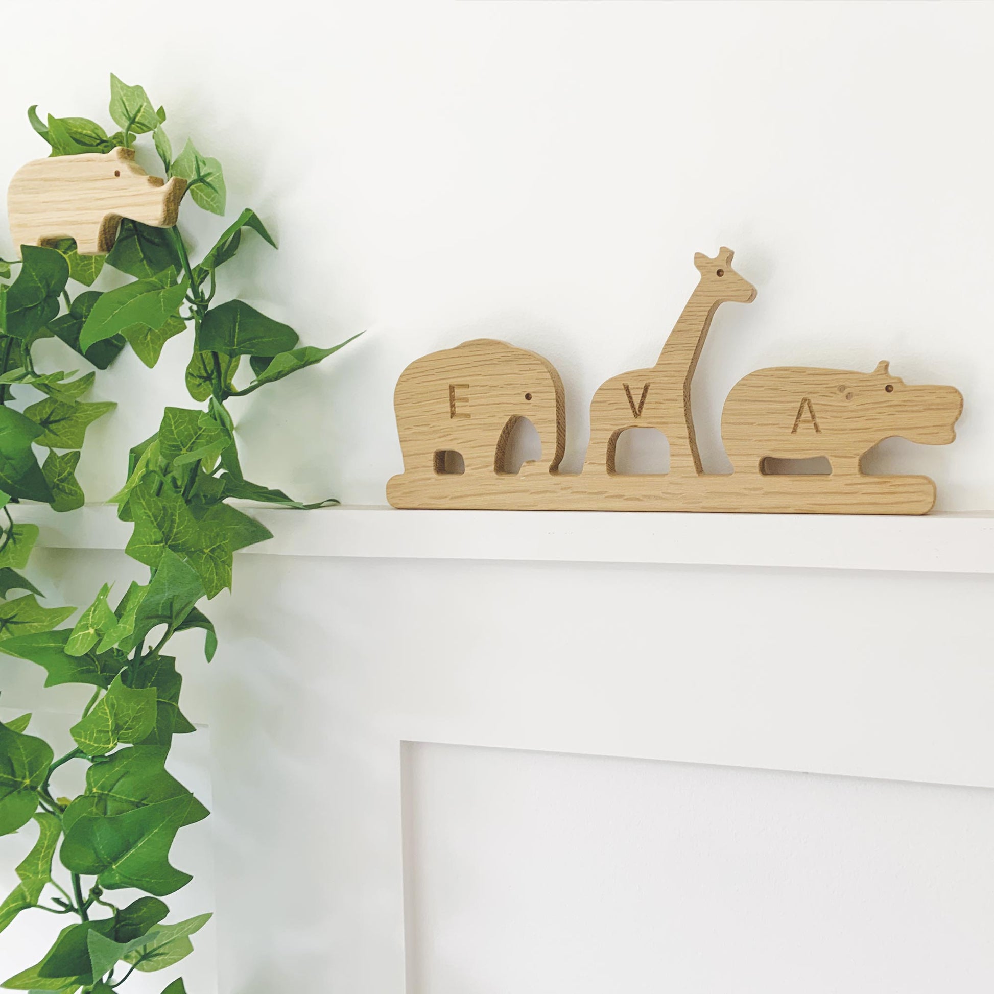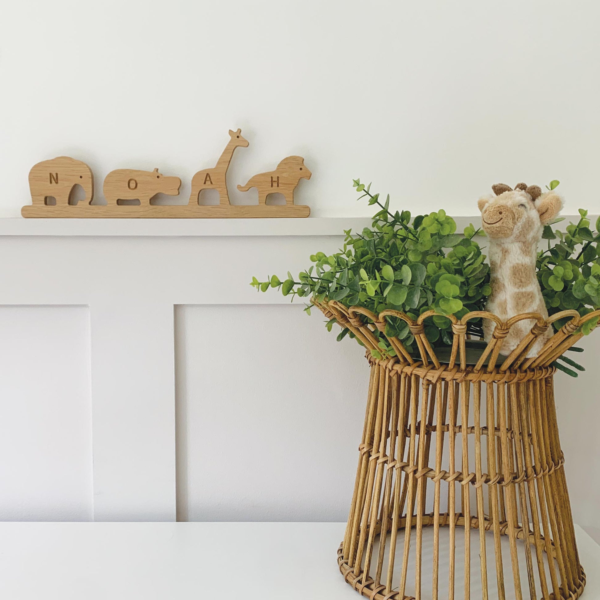These beautiful baby name signs will make the perfect addition to your safari themed nursery! Made from solid oak, these personalised name signs feature a mixture of safari animals including an elephant, giraffe, hippo, rhino and lion. Each sign can include between 2 – 6 animals/letters, and measure between ~15 – 50cm wide. Each name sign is ~10cm tall at the tallest point, and ~1cm in depth.