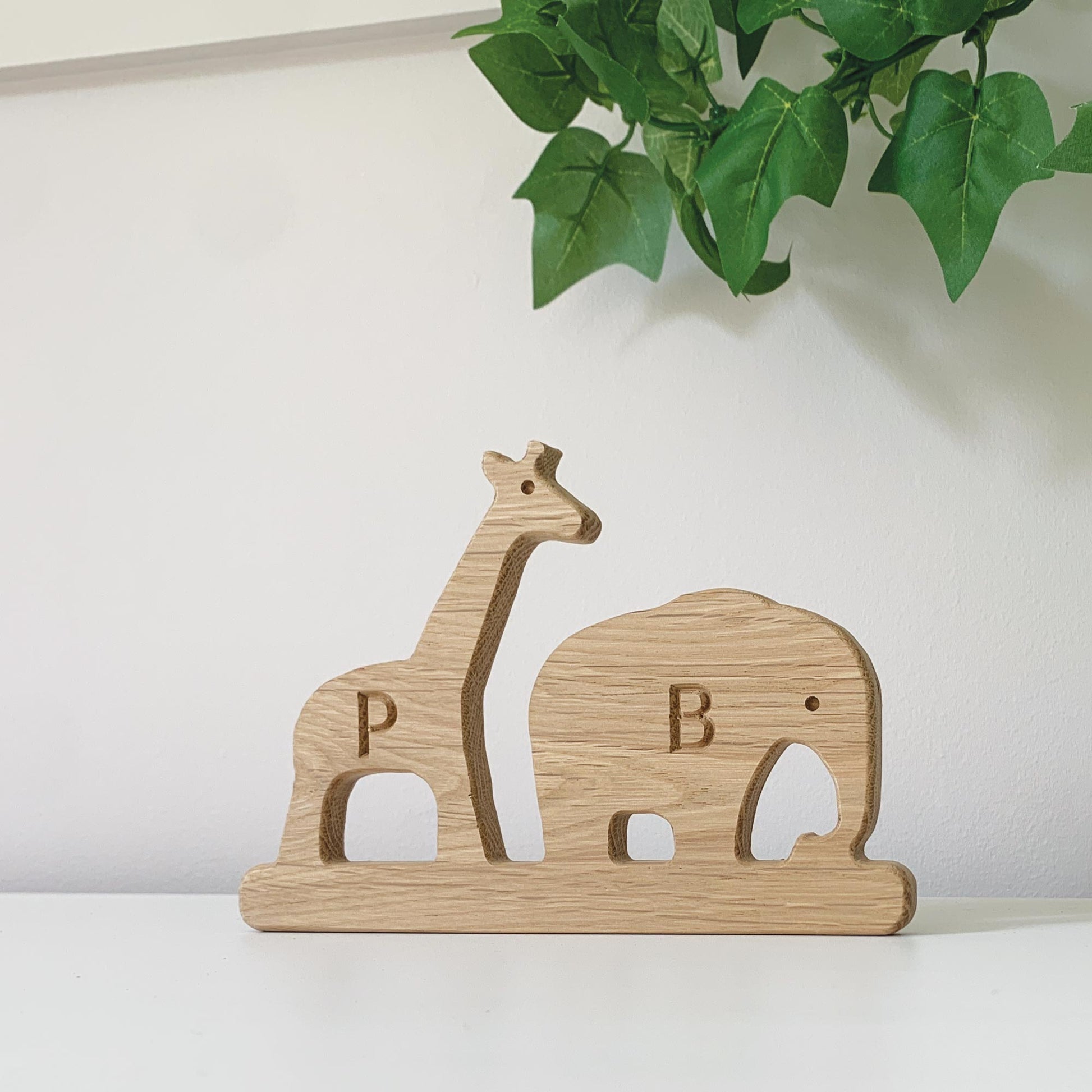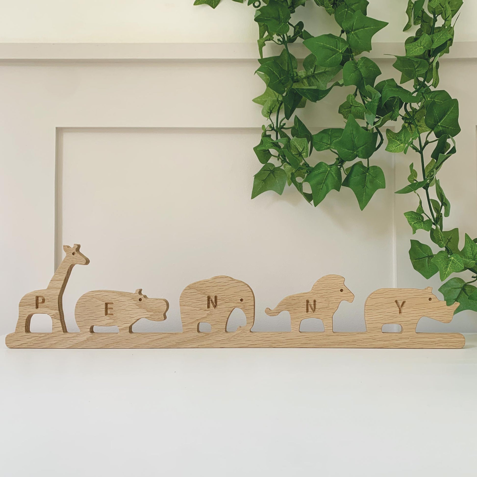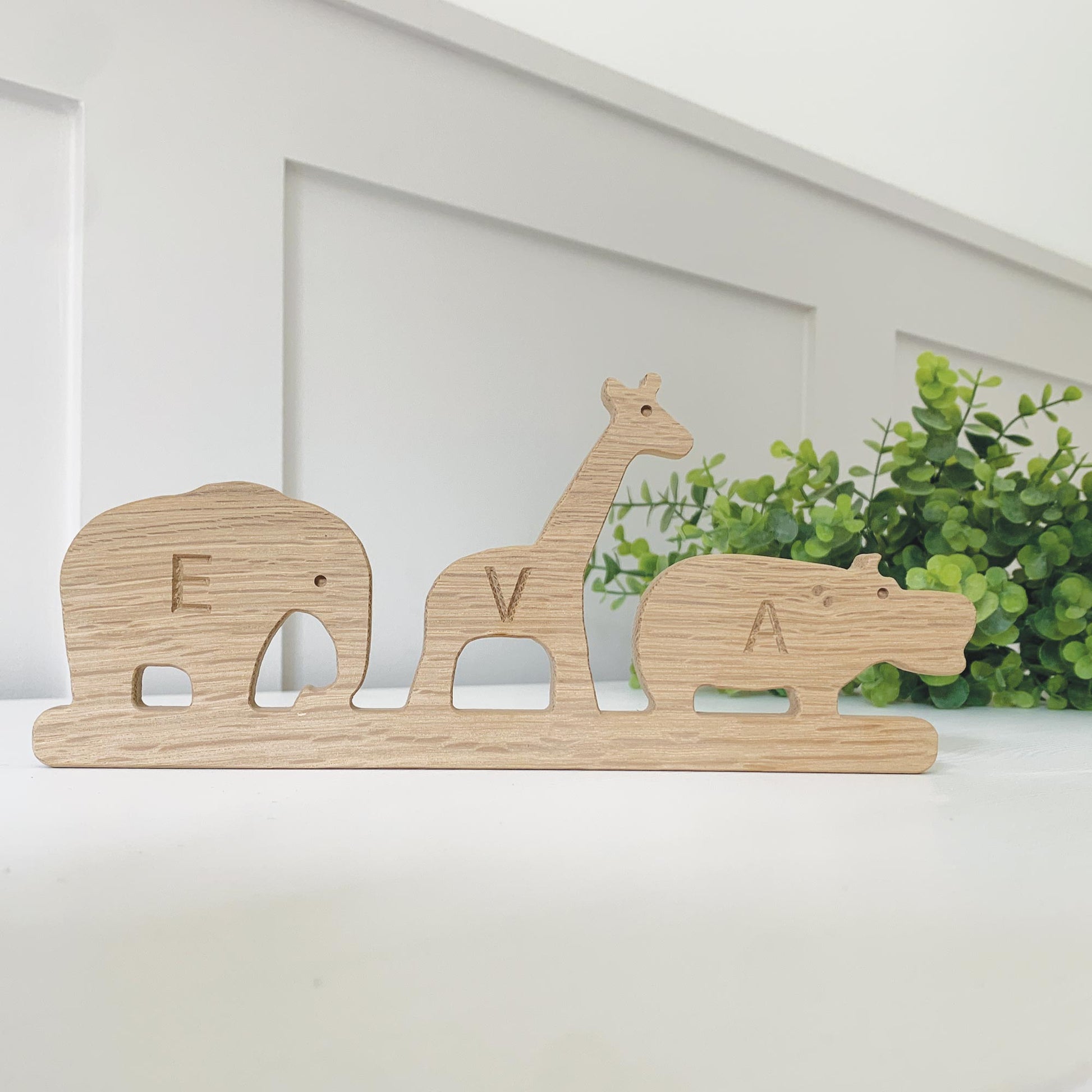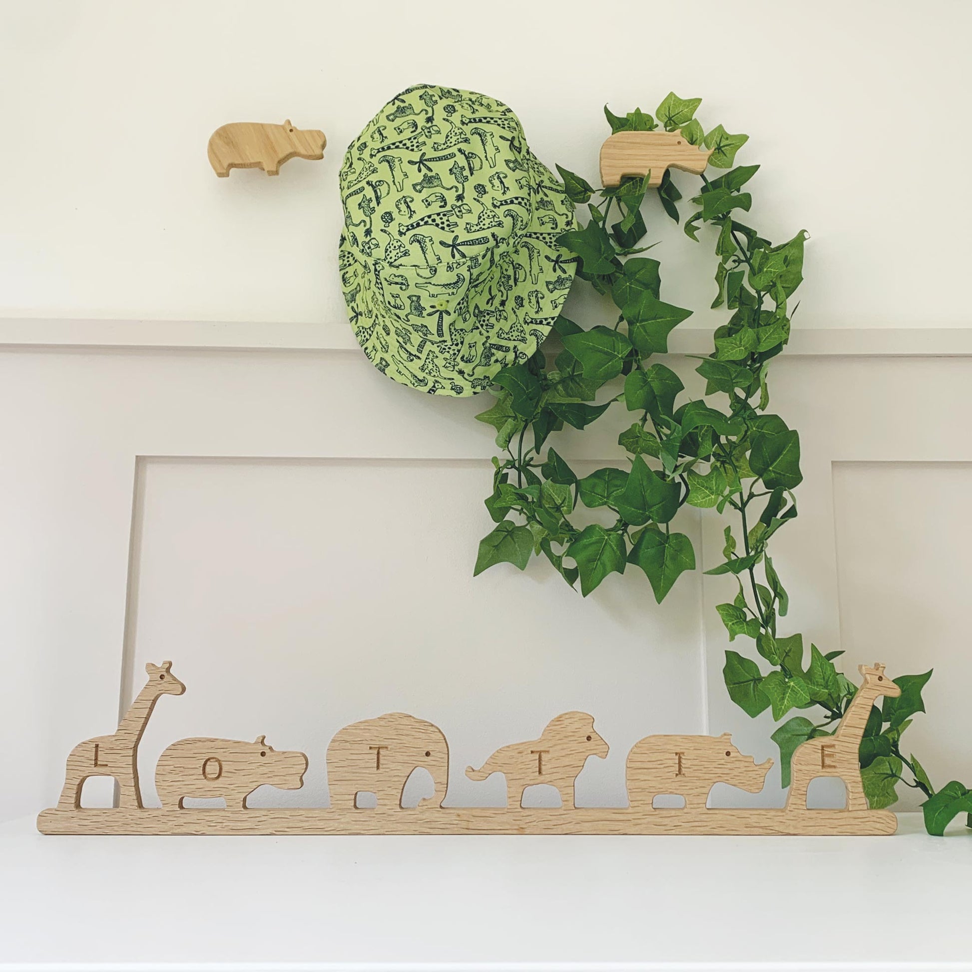 These beautiful baby name signs will make the perfect addition to your safari themed nursery! Made from solid oak, these personalised name signs feature a mixture of safari animals including an elephant, giraffe, hippo, rhino and lion. Each sign can include between 2 – 6 animals/letters, and measure between ~15 – 50cm wide. Each name sign is ~10cm tall at the tallest point, and ~1cm in depth.