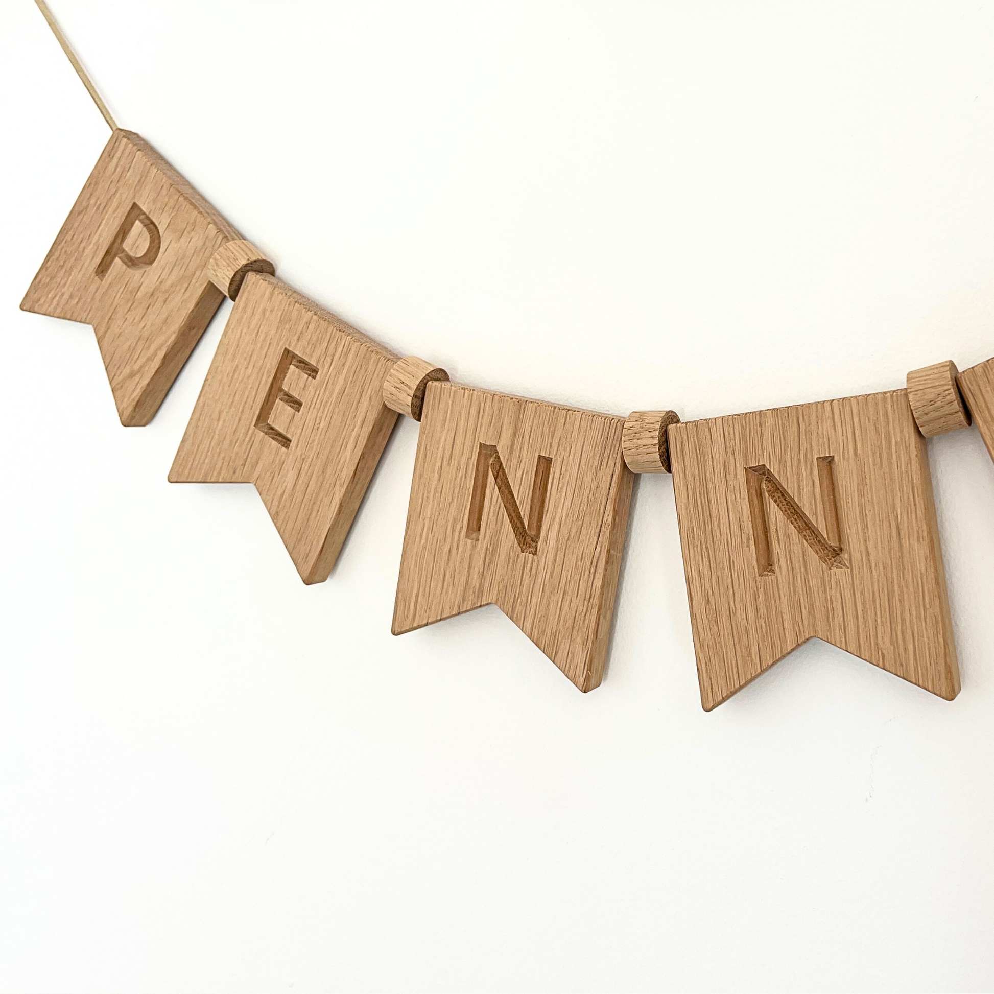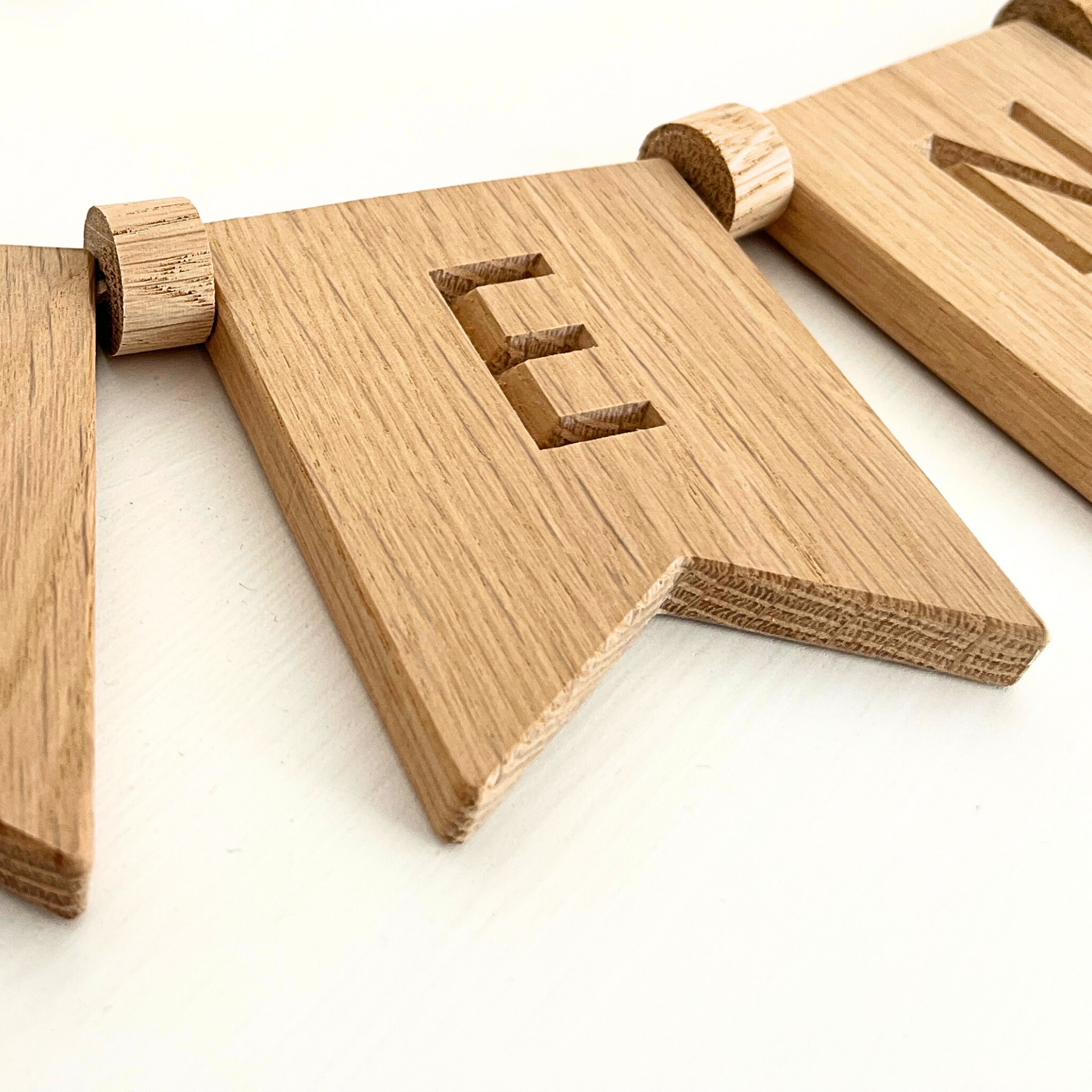 This personalised bunting adds charm to your baby's nursery decor and also makes a truly unique baby shower or birthday gift. It is made from the finest solid oak, and features a neutral suede cord and personalised flags. This wooden bunting can be personalised with your little ones name or initials, and gives a high quality, sophisticated look.