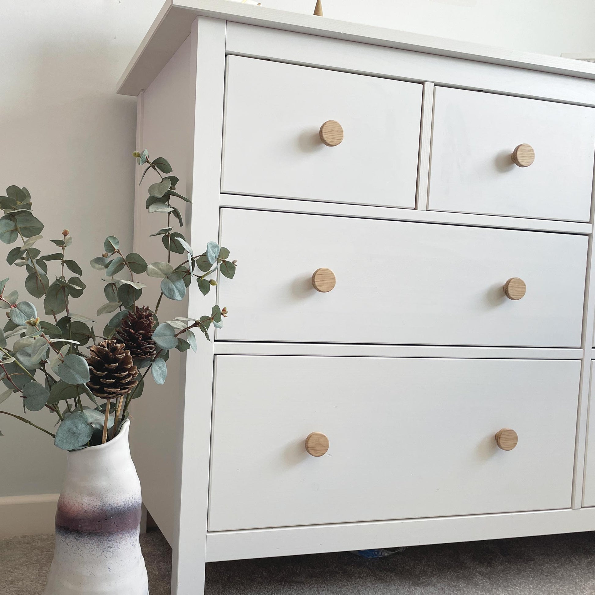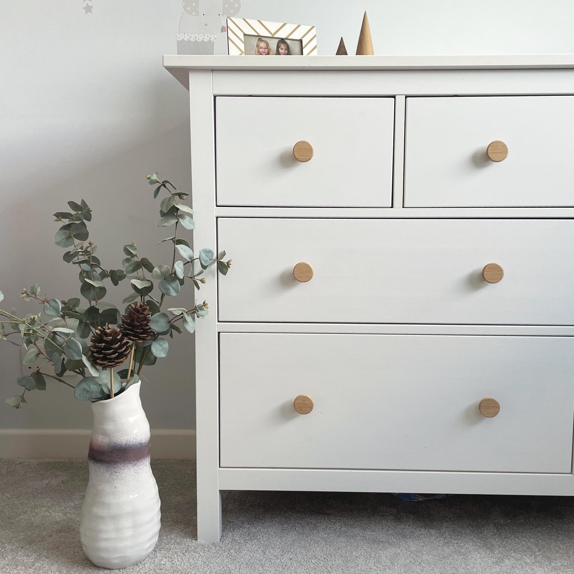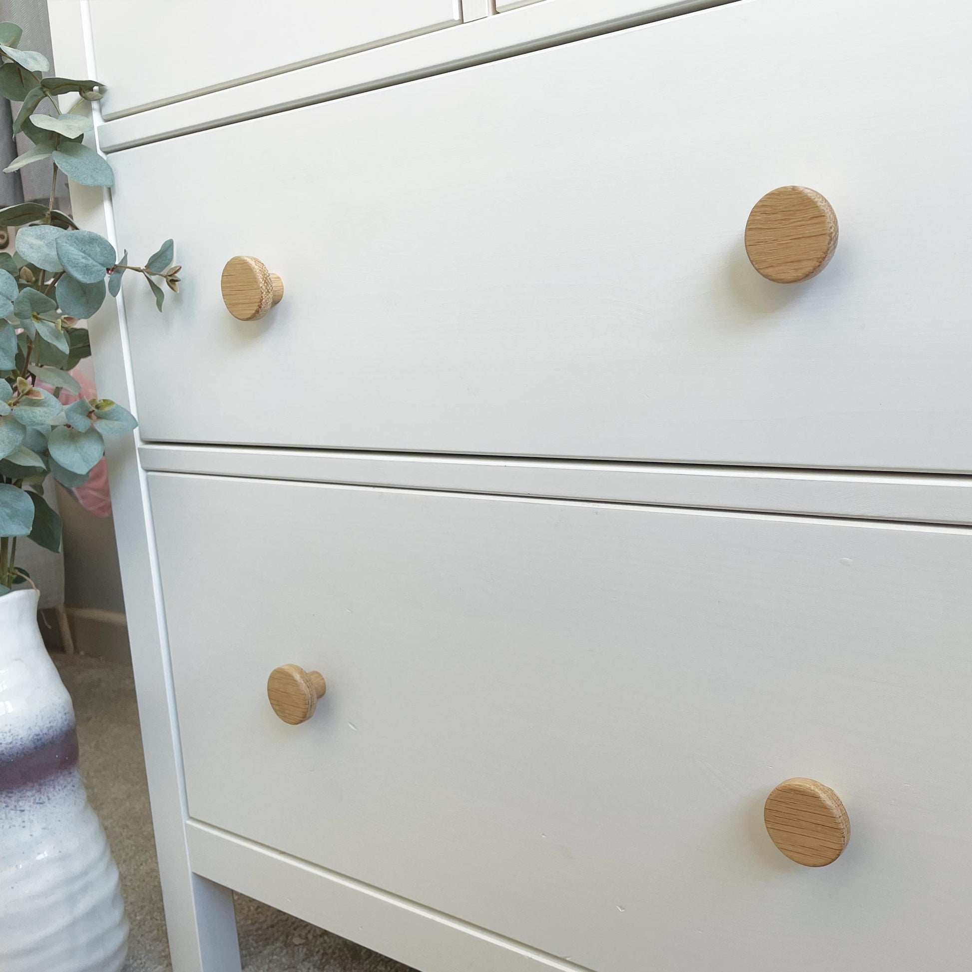 Refresh your furniture with these solid oak, round wooden drawer knobs, perfect for a chest of drawers, cupboard, wardrobe or bedside table! These wooden drawer knobs are great for adding some warmth and character to a new unit or upcycle project. The warm oak pairs well with almost any furniture colour. They can be used on a chest of drawers, bedside tables, wardrobes, dressing tables, hall tables or even kitchen cabinets!