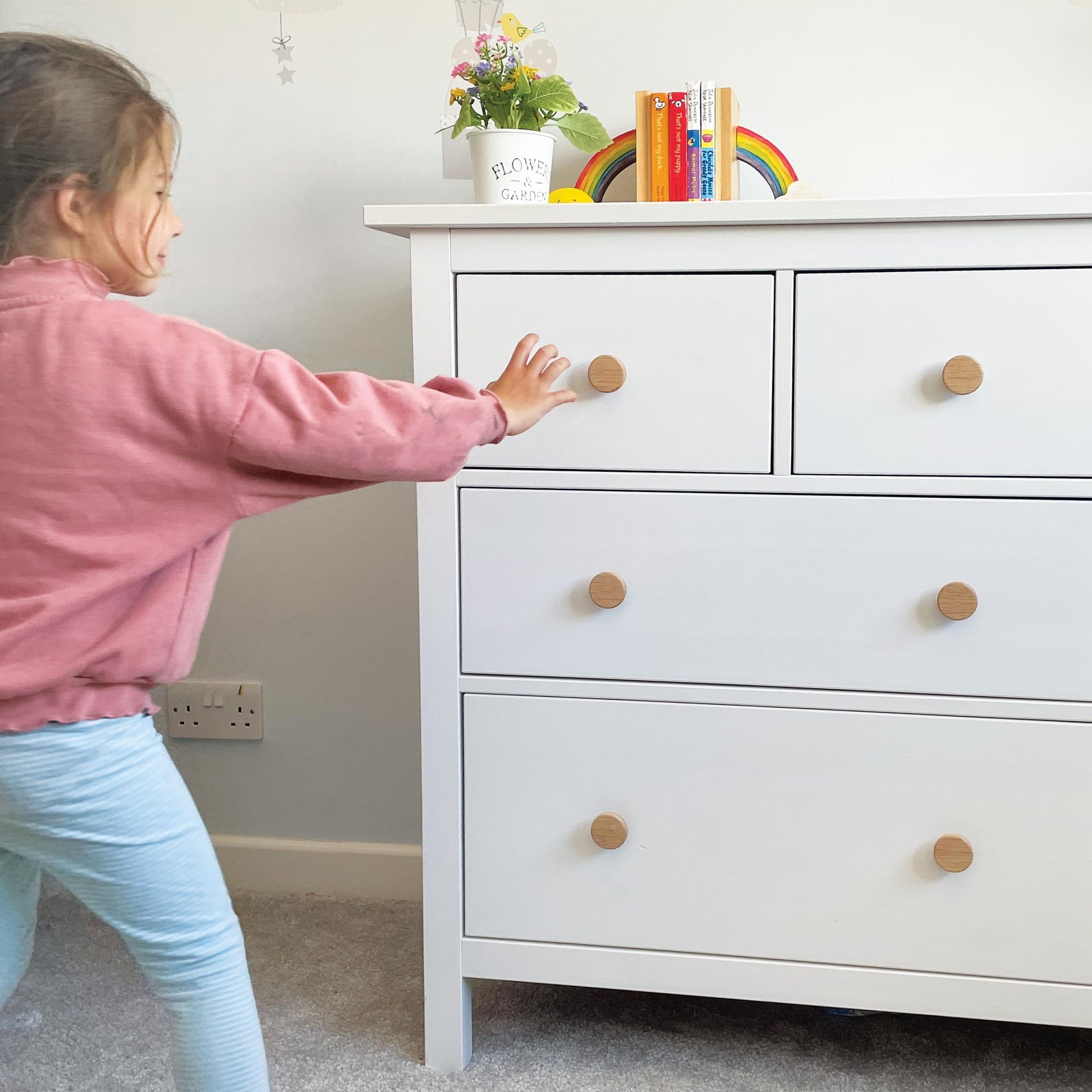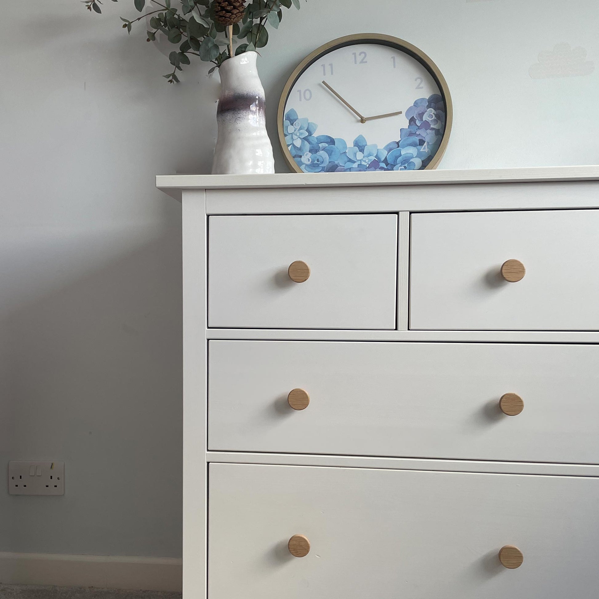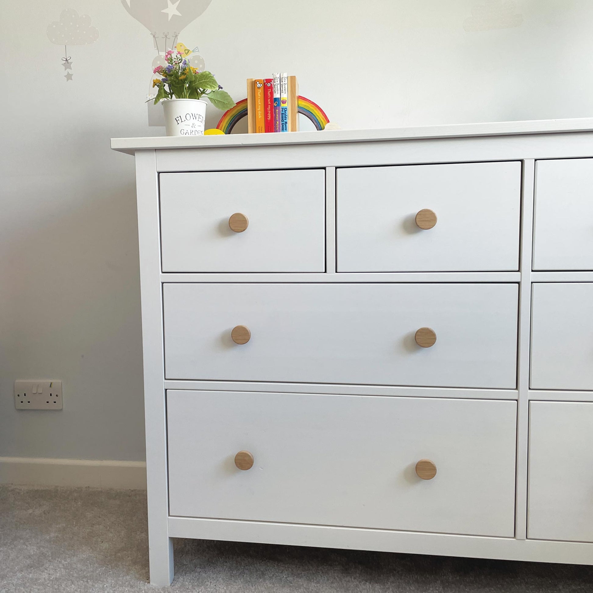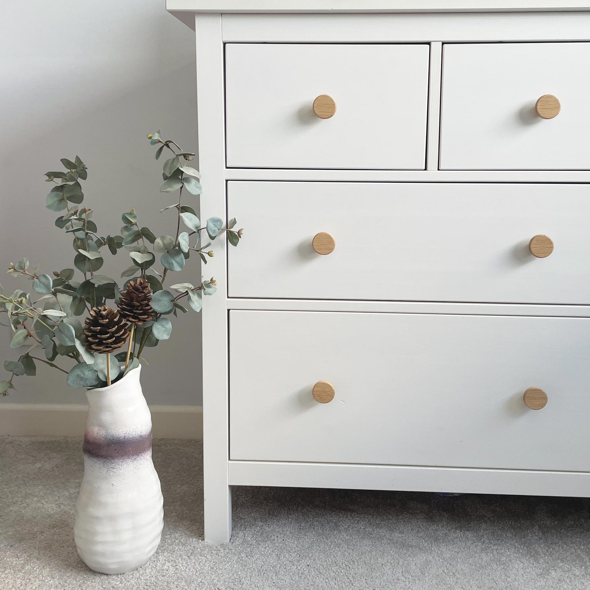 Refresh your furniture with these solid oak, round wooden drawer knobs, perfect for a chest of drawers, cupboard, wardrobe or bedside table! These wooden drawer knobs are great for adding some warmth and character to a new unit or upcycle project. The warm oak pairs well with almost any furniture colour. They can be used on a chest of drawers, bedside tables, wardrobes, dressing tables, hall tables or even kitchen cabinets!