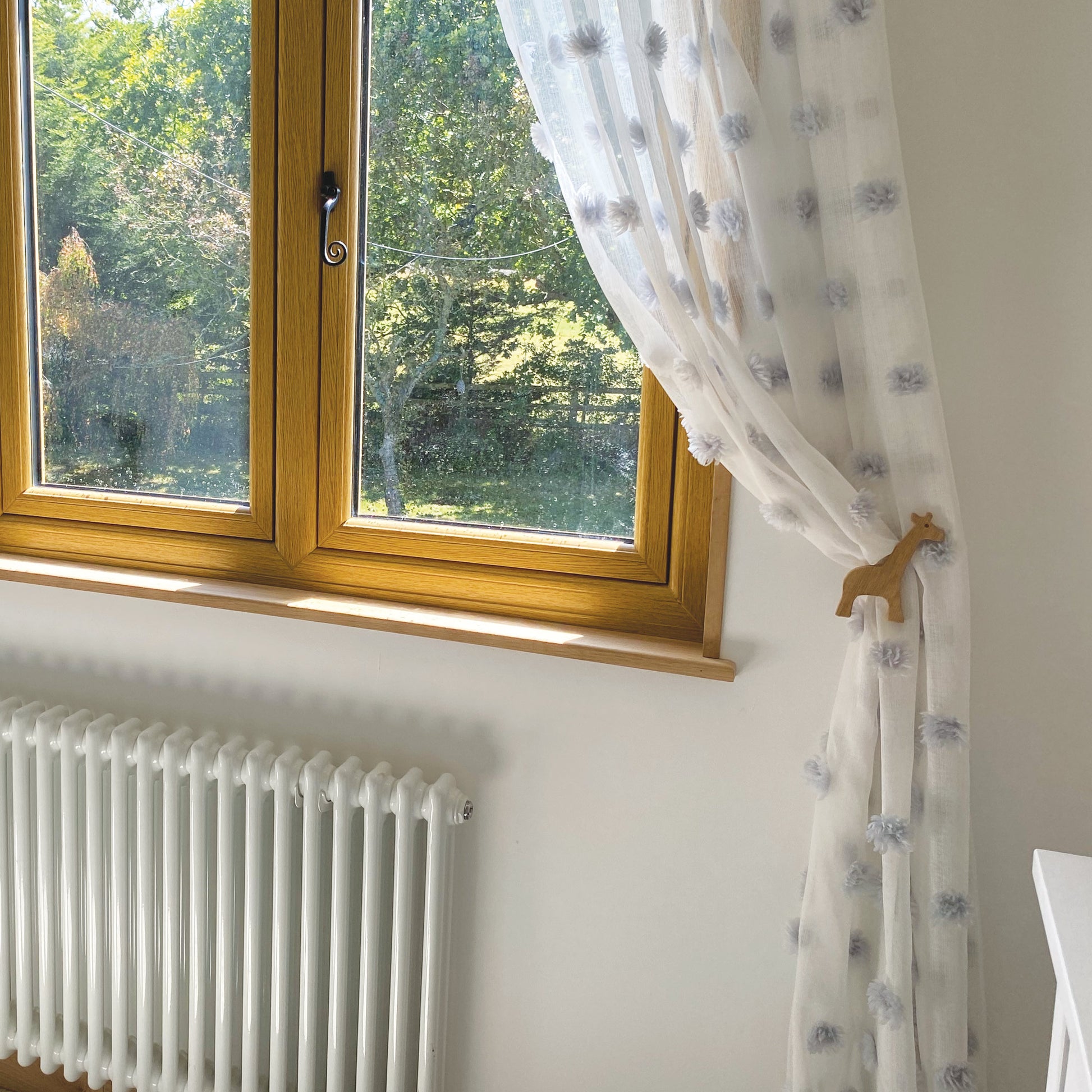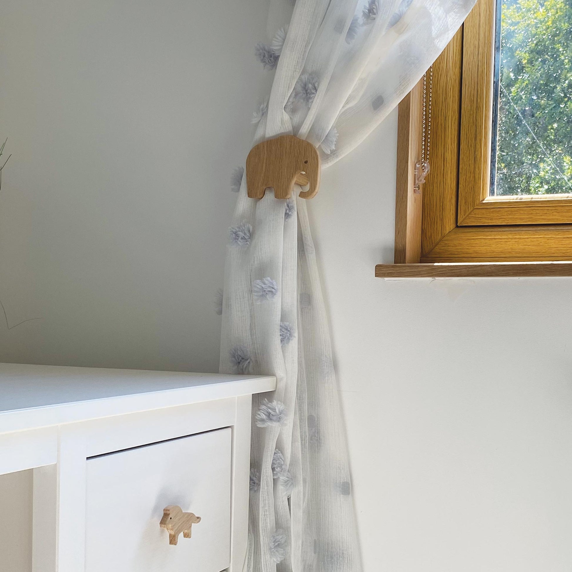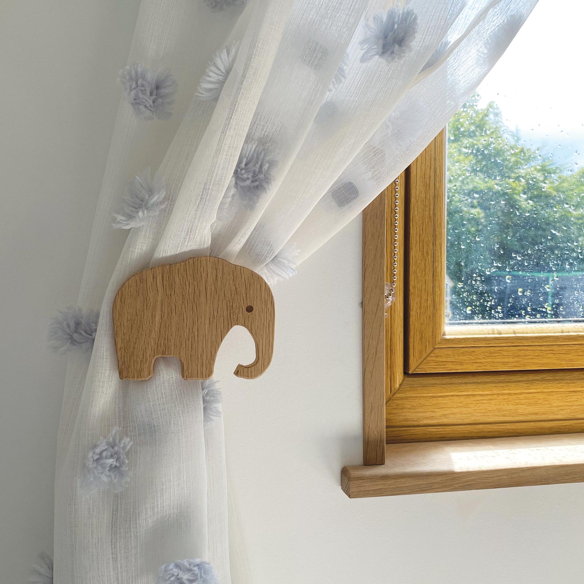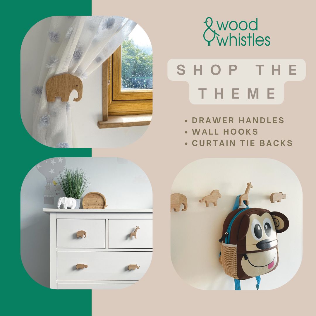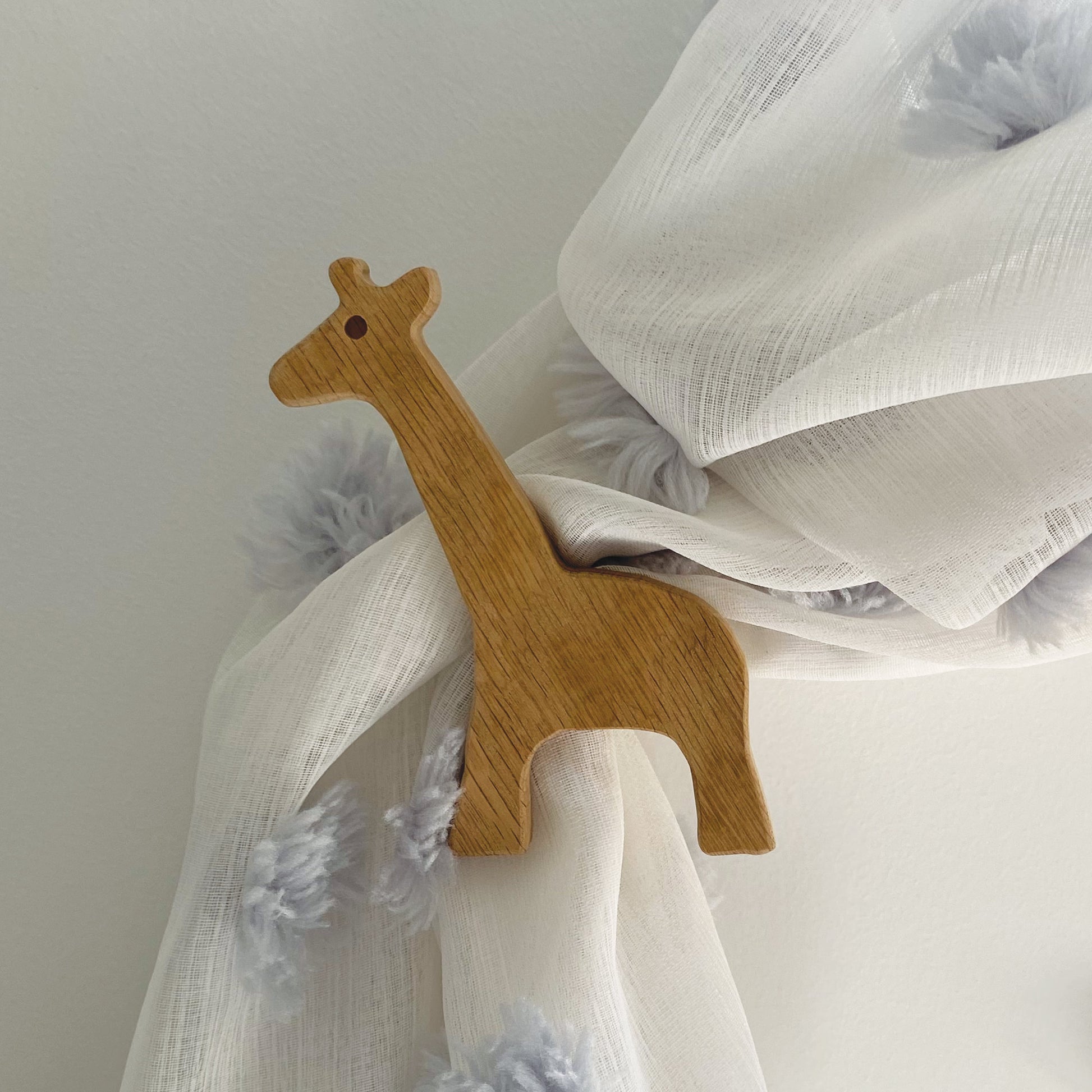 These unique curtain tie backs for kids make a great addition to your safari nursery décor and are sure to grab your little one’s attention! If you are creating a safari theme or jungle theme nursery, these solid oak curtain holdbacks are perfect for you. They look great in a bedroom or play room and add a little whimsical character to your decor. They are made of solid oak and are available in the shape of an elephant or giraffe. Each curtain hook measures approximately 12 cm x 9 cm and protrudes 8 cm from the wall. They are supplied with rawl plugs.
